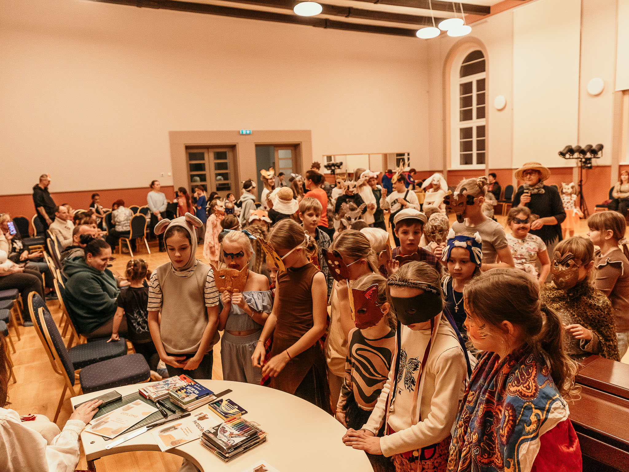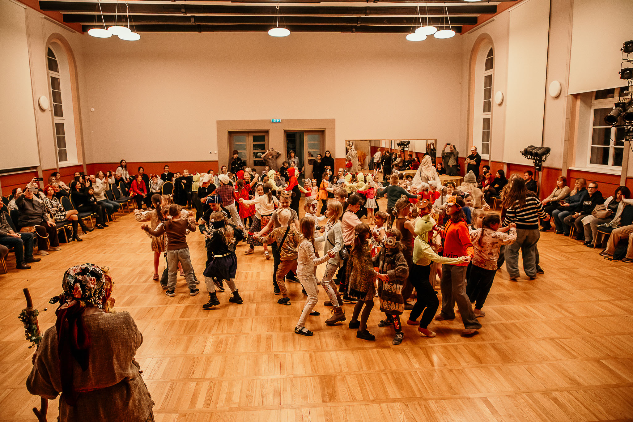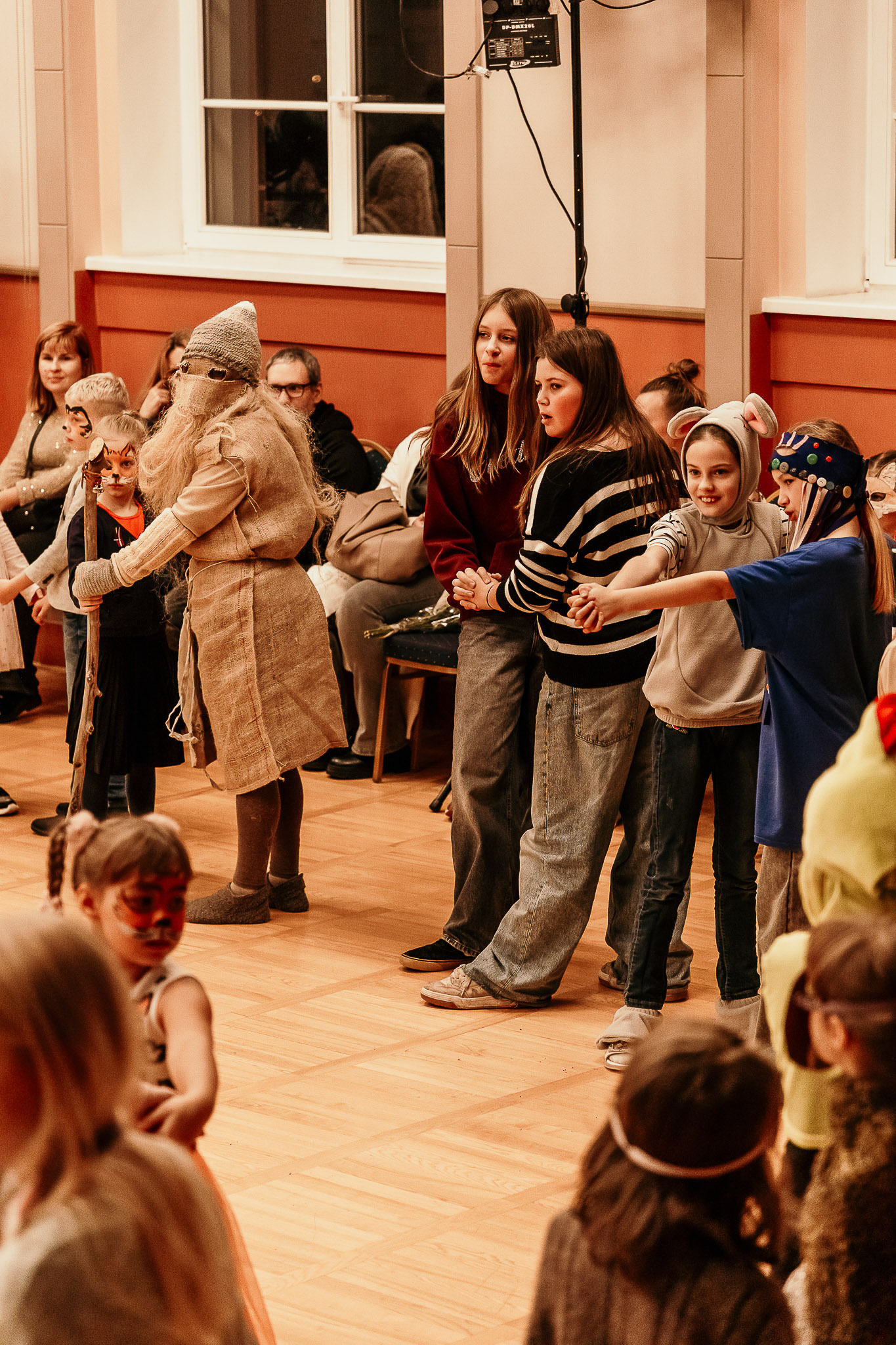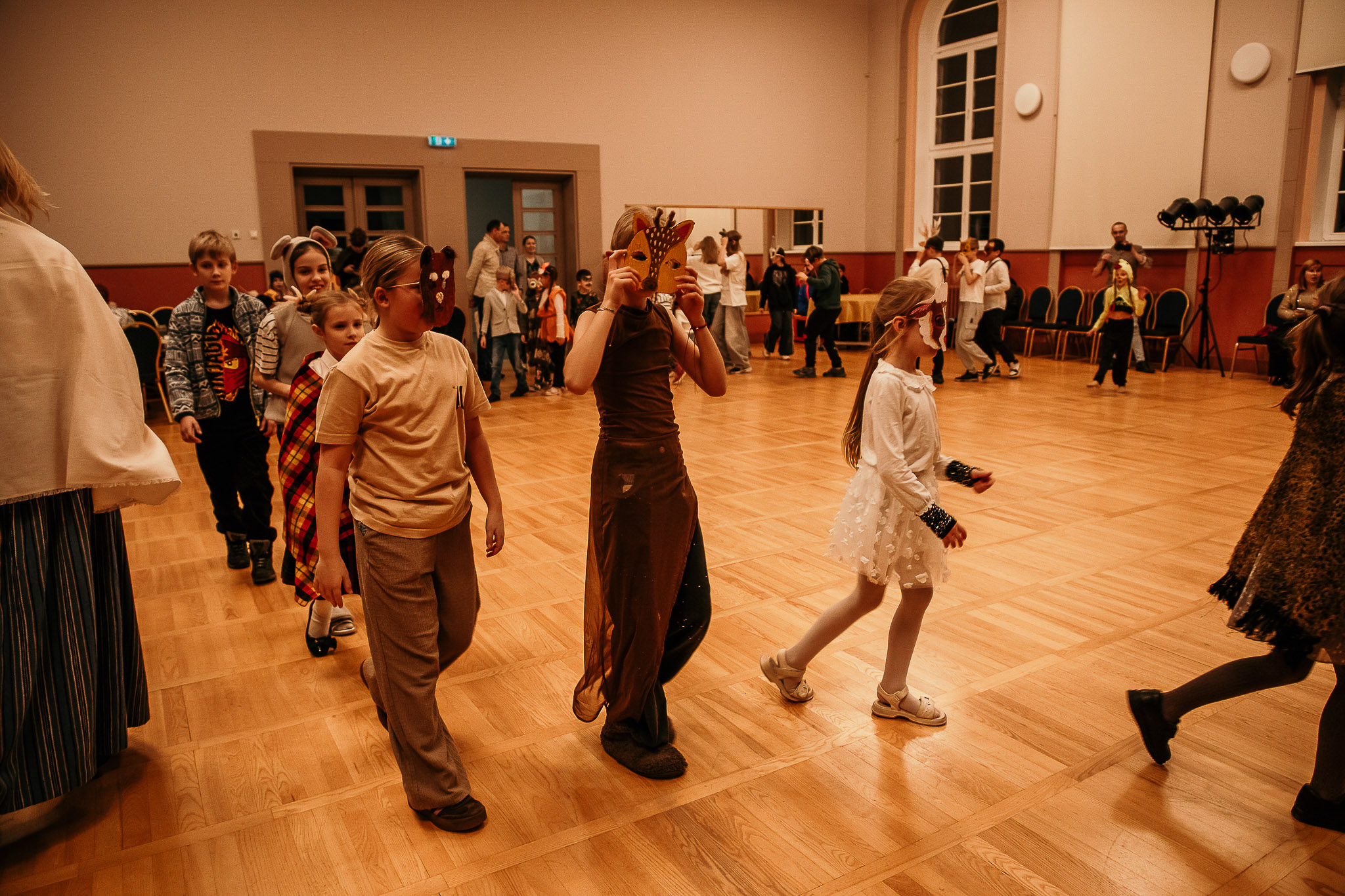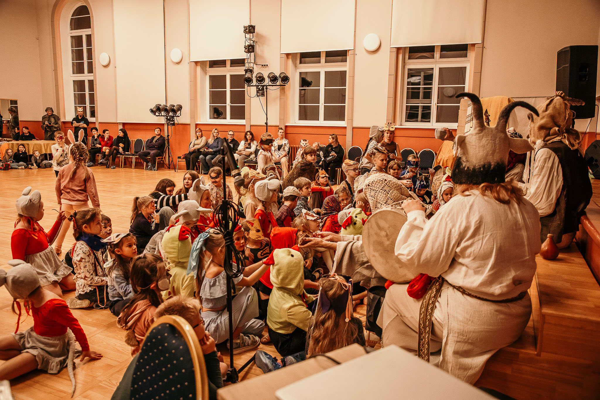 Pēc tam ieradās tautas tradīciju grupa “Budēļi”, kas lika visiem zālē atdzīvoties. Viņi stāstīja par budēļu masku nozīmi, aicināja visus bērnus piedalīties jautrās dejās un rotaļās, atgādinot senās Mārtiņdienas paražas.