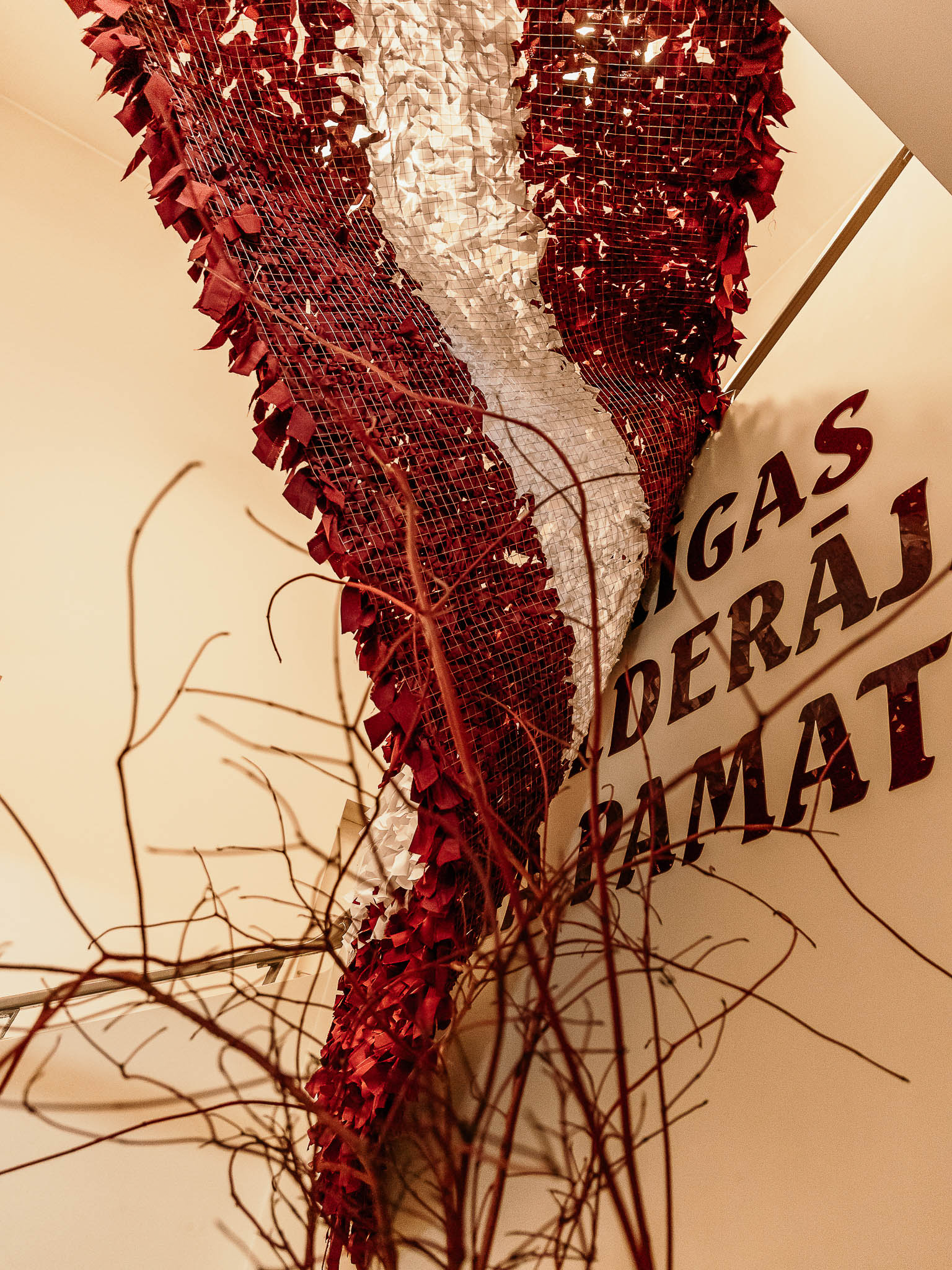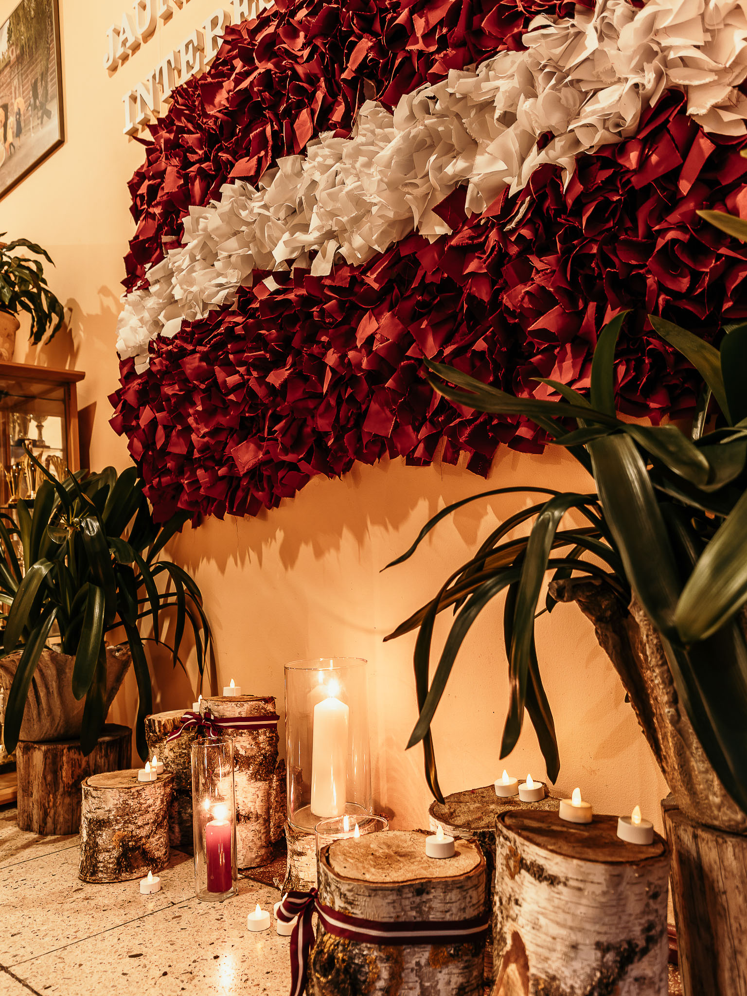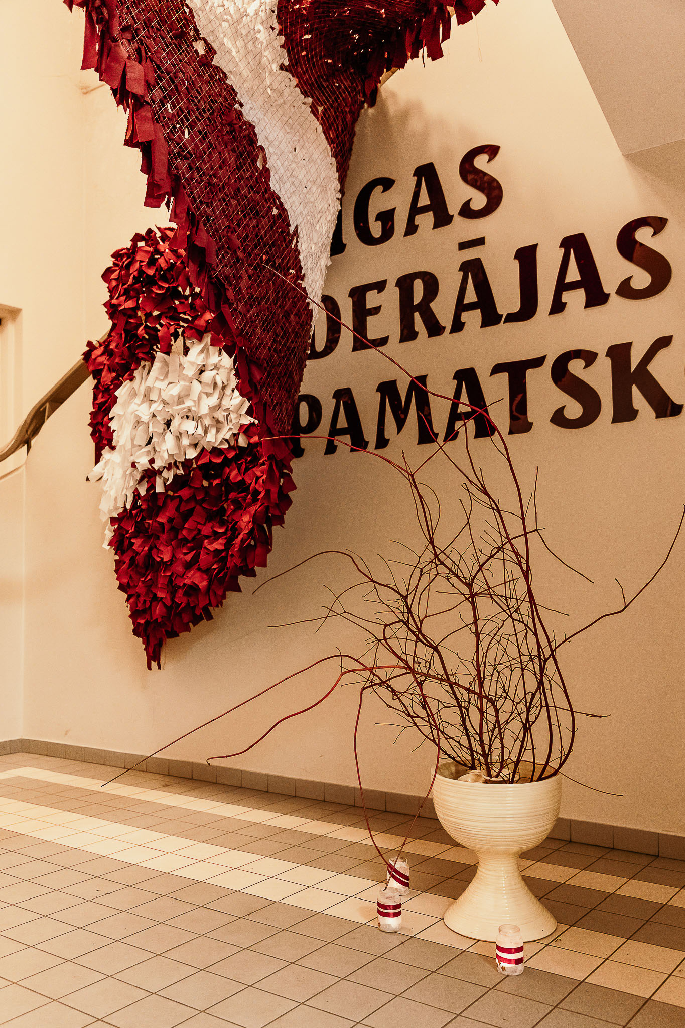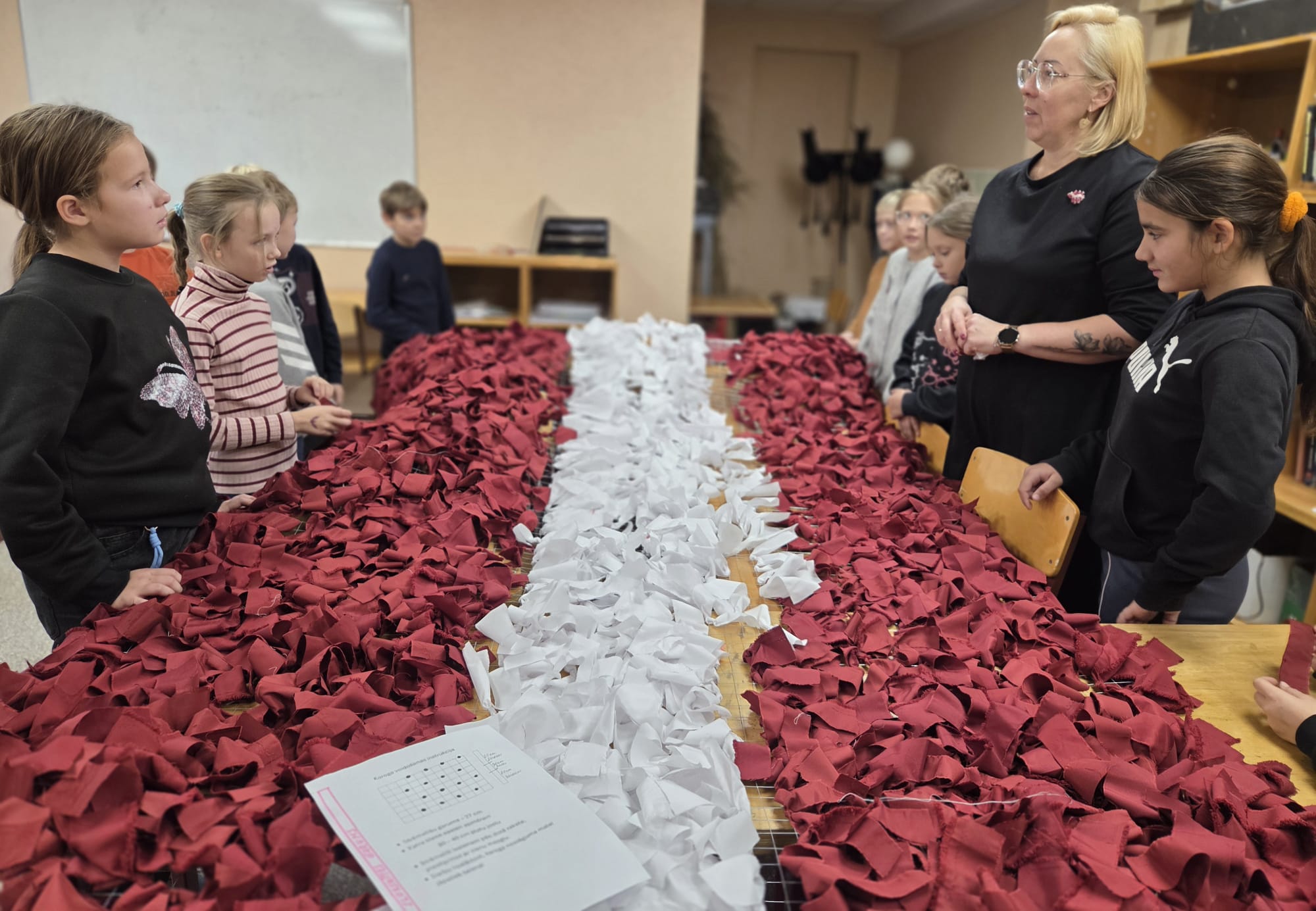 Tika sagatavota 1,5 metrus plata metāla sieta pamatne, uz kuras skolēni un interešu izglītības audzēkņi kopā ar pedagogiem iesēja karmīnsarkanas un baltas lentītes, veidojot Latvijas karogu. Katru lentīti iesienot, dalībnieki tajā iepina labas domas, vēlējumus un pateicību Latvijai.