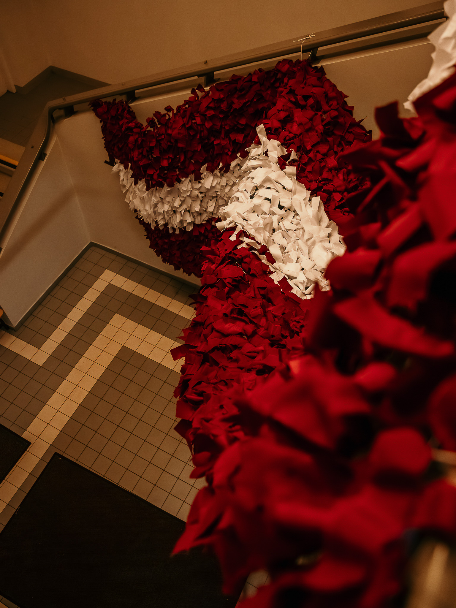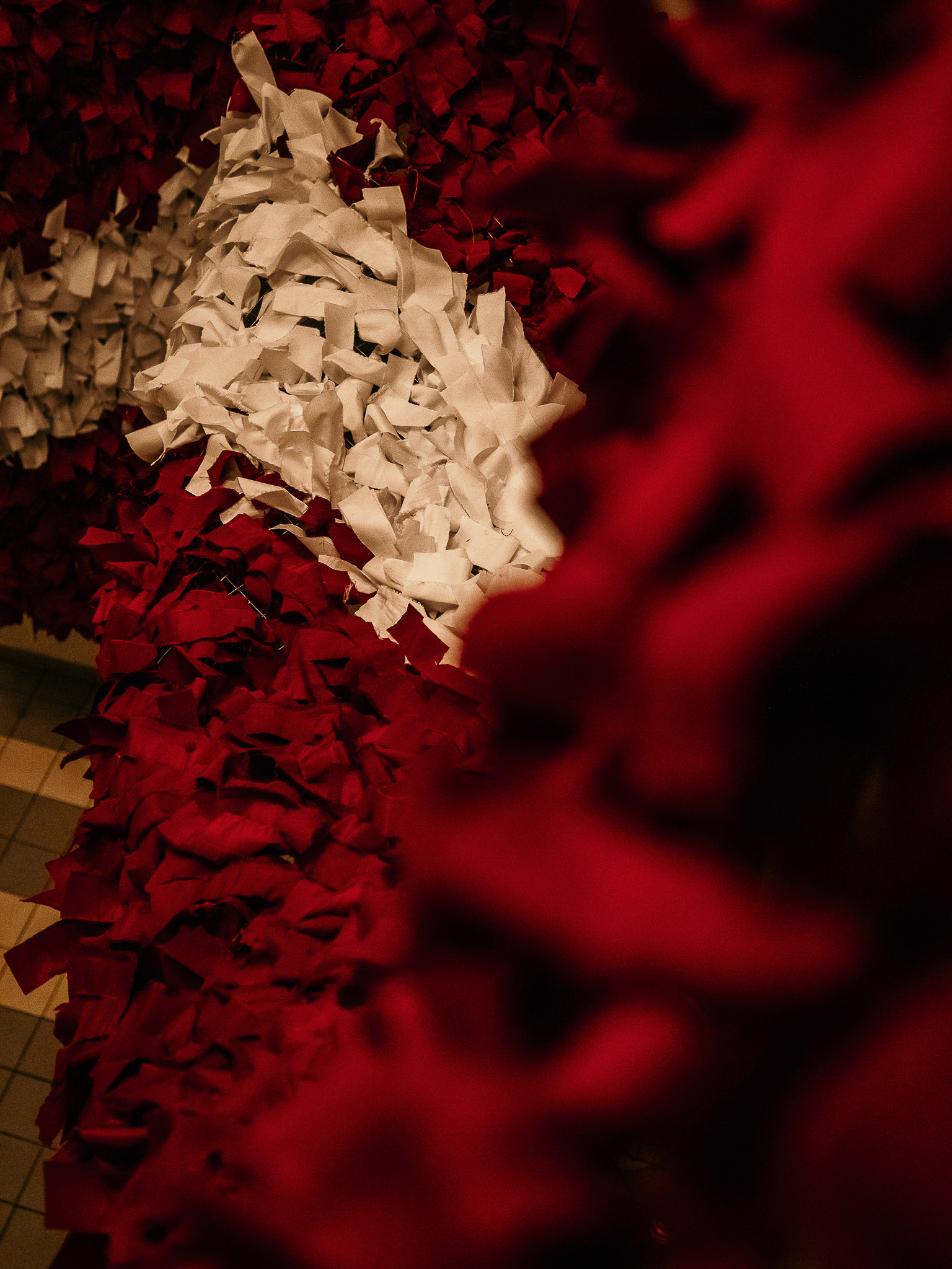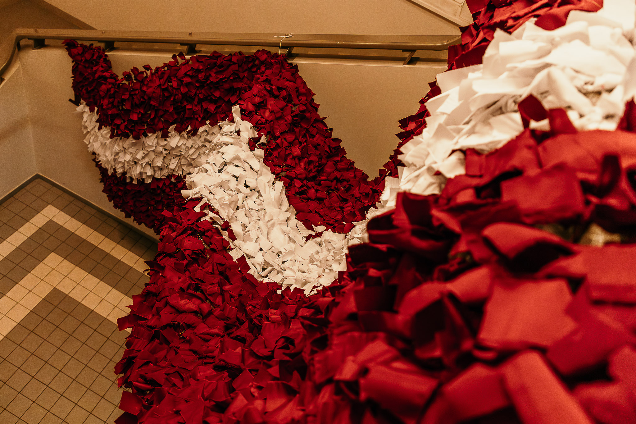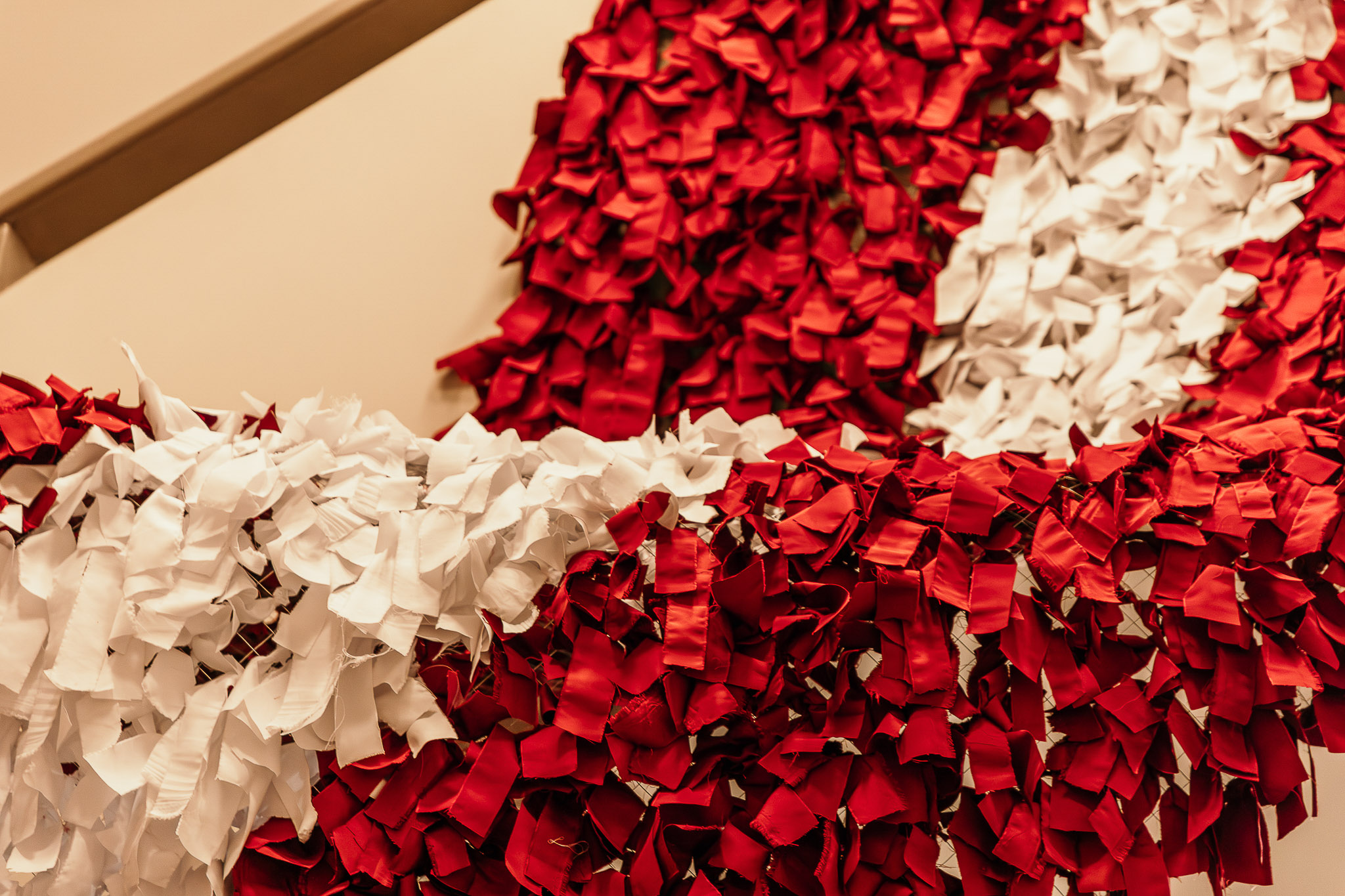 Tika sagatavota 1,5 metrus plata metāla sieta pamatne, uz kuras skolēni un interešu izglītības audzēkņi kopā ar pedagogiem iesēja karmīnsarkanas un baltas lentītes, veidojot Latvijas karogu. Katru lentīti iesienot, dalībnieki tajā iepina labas domas, vēlējumus un pateicību Latvijai.